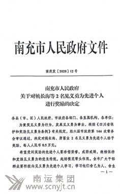 2020年12月底,經(jīng)六屆南充市人民政府第144次常務(wù)會(huì)議審議通過(guò),決定對(duì)姚長(zhǎng)海、唐富業(yè)2名見(jiàn)義勇為先進(jìn)個(gè)人進(jìn)行獎(jiǎng)勵(lì),每人0.5萬(wàn)元人民幣,并下發(fā)《關(guān)于對(duì)姚長(zhǎng)海等2名見(jiàn)義勇為先進(jìn)個(gè)人進(jìn)行獎(jiǎng)勵(lì)的決定》(南府發(fā)〔2020〕12號(hào))。
