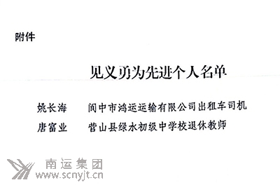 姚長(zhǎng)海作為南運(yùn)集團(tuán)出租車駕駛員,為南充出租行業(yè)爭(zhēng)了光,為社會(huì)、也為出租車駕駛員及公司員工樹(shù)立了良好的榜樣。希望廣大員工向姚長(zhǎng)海同志學(xué)習(xí),做一個(gè)樂(lè)于助人、道德高尚、受人尊敬的人,為提升企業(yè)形象、建設(shè)平安南充作出新的更大貢獻(xiàn)。