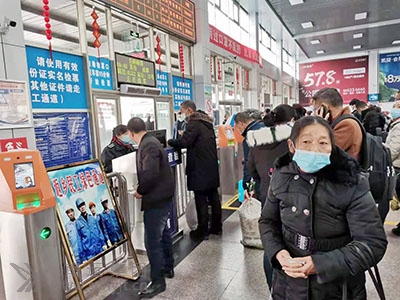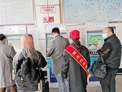 與以往熙熙攘攘、摩肩接踵的景象不同,空曠的售票大廳里,返崗的旅客掃碼、測溫、保持間距,喧囂不再,但一切井然有序。3個售票窗口有三三兩兩的旅客在購票。車站網上購票的旅客已增加到60%。在1名“小紅帽”站務人員的引導下,旅客們在10臺自助(售)取票機前便捷的。ㄙ彛┢。另1個廣東、深圳、汕頭、福建、溫州的售票窗口基本上無人問津。為了方便農民工回家返崗,車站專門設置了農民工服務臺、農民工優(yōu)先售票窗口和農民工檢票進站綠色通道,車站工作人員熱情為農民工提供指路、購票、咨詢、搬運行李、維護秩序等服務,深受農民工歡迎。