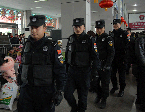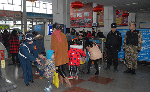 中午1點(diǎn)多鐘,由于成南高速公路私家小車流量增大,嚴(yán)重堵車,造成加班車輛不能及時(shí)返回車站,致使到成都的旅客排著兩列隊(duì)伍從候車廳8號(hào)檢票口一直延伸到5號(hào)檢票口對(duì)面的候車廳內(nèi)。但一直沒(méi)有看見(jiàn)到成都排隊(duì)上車的隊(duì)伍延伸到候車廳外,象往年那樣在站前廣場(chǎng)蜿蜒曲折“山路十八彎”的情景了。懸掛著12個(gè)大紅燈籠的整個(gè)候車大廳里旅客十分擁擠,人滿為患,卻暖意融融。車站派出所所長(zhǎng)楊宗明帶領(lǐng)6名公安干警和嘉陵區(qū)公安分局的8名特警來(lái)回巡邏執(zhí)勤,反恐防暴,高度警惕地維護(hù)著檢票上車和旅客候車秩序。